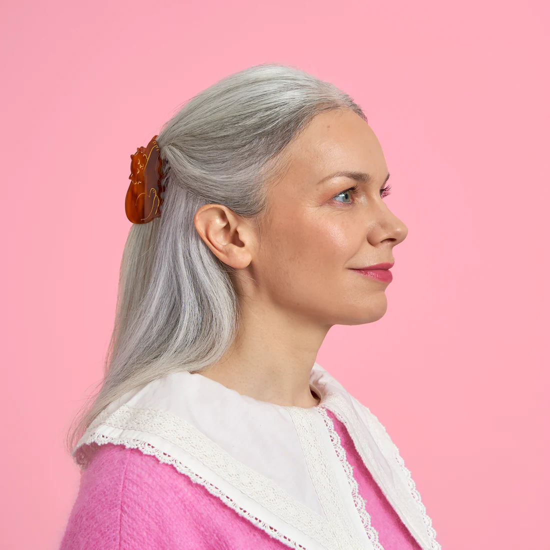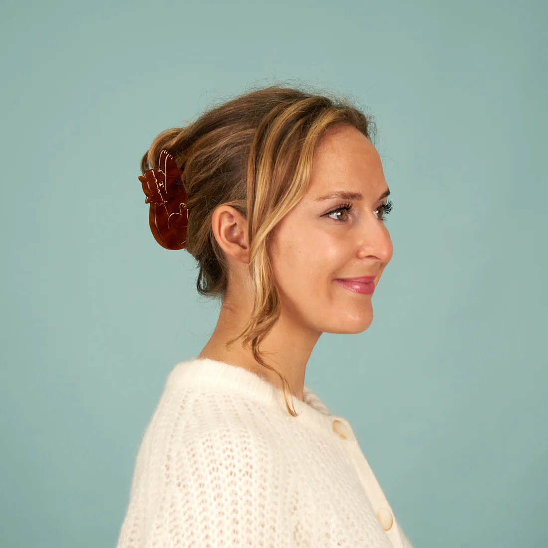 Il più carino dei gatti marroni, sorpreso a riposare con le zampe tese e il suo piccolo sorriso malizioso. Questa pinza per capelli felina aspetta di essere arrotolata nei nostri chignon per un meritato riposo.