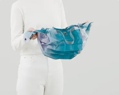 Una borsa compatta realizzata in tessuto riciclato al 100% che può essere ripiegata in un attimo. Questa è una collezione riciclata in edizione limitata.