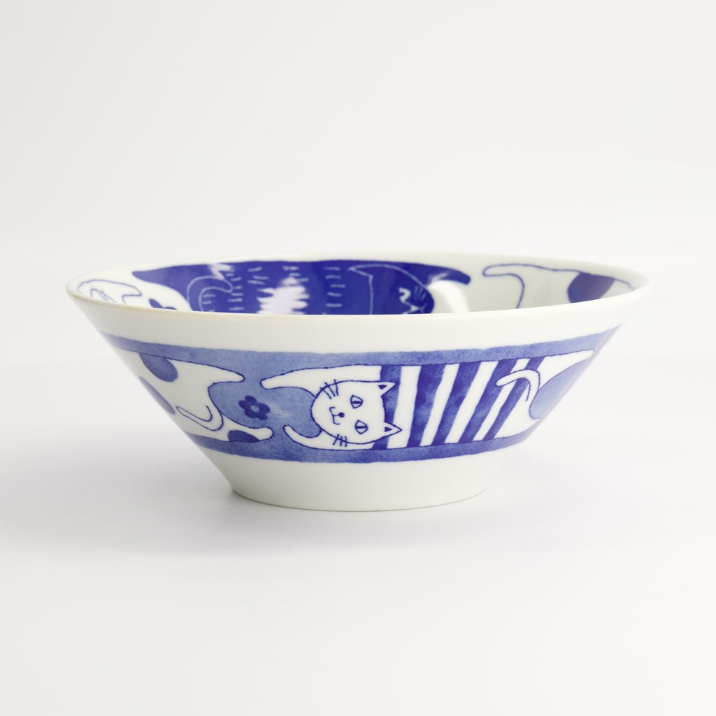 Questa ciotola in ceramica raffigura una serie di gatti di tutti i colori che si alternano e si inseguono.