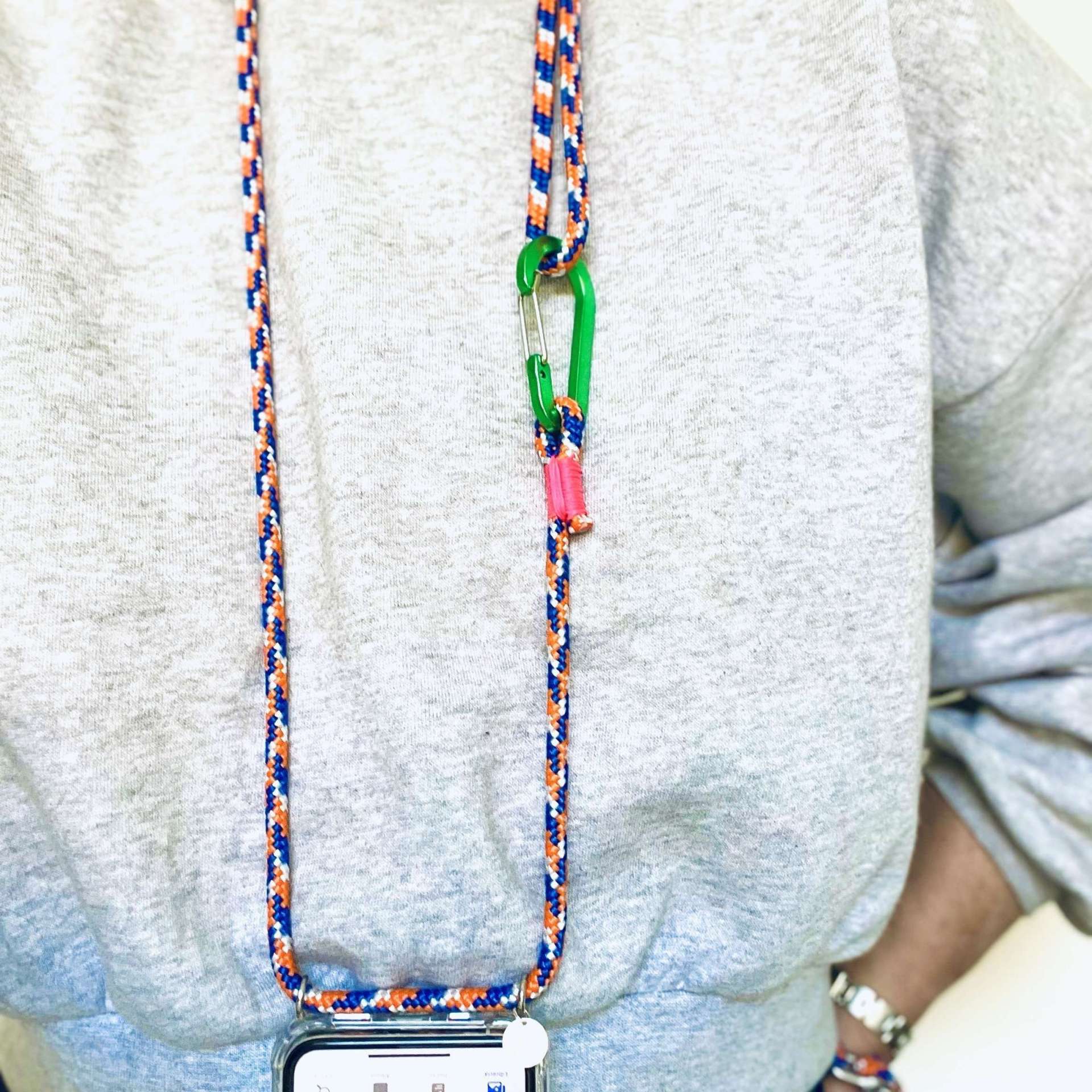 Collana per telefono in paracord multicolore con moschettone verde e cover trasparente per cellulare.