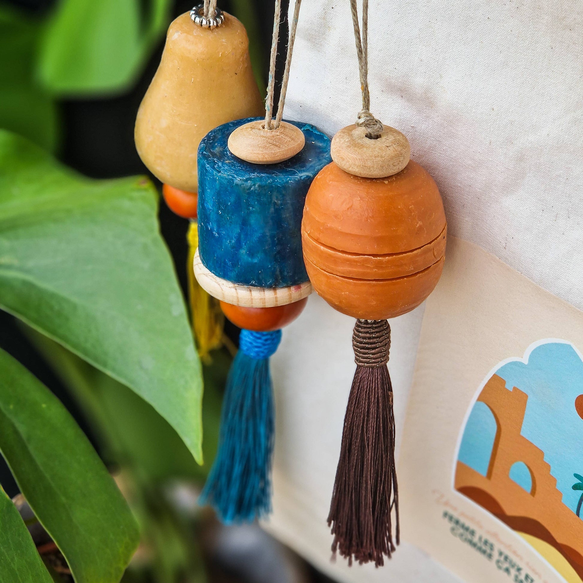 Un profumo d'ambiente fuori dal comune, su filato, assemblato con perle e nappine per un oggetto decorativo che profumerà la tua casa.