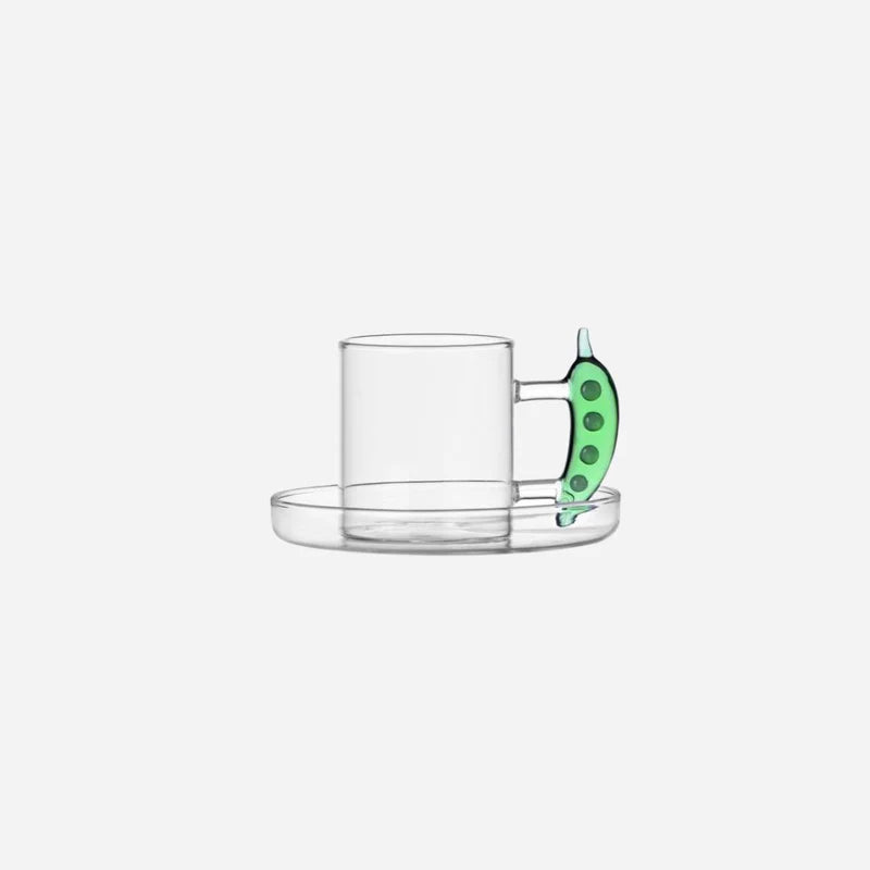 La tazza da caffè Peas appartiene a questa collezione ricca di fascino: è realizzata interamente a mano in vetro soffiato e lavorato a fiamma, con in rilievo una delicata rappresentazione di piselli che emergono come un piccolo gioiello sul bordo della tazza.