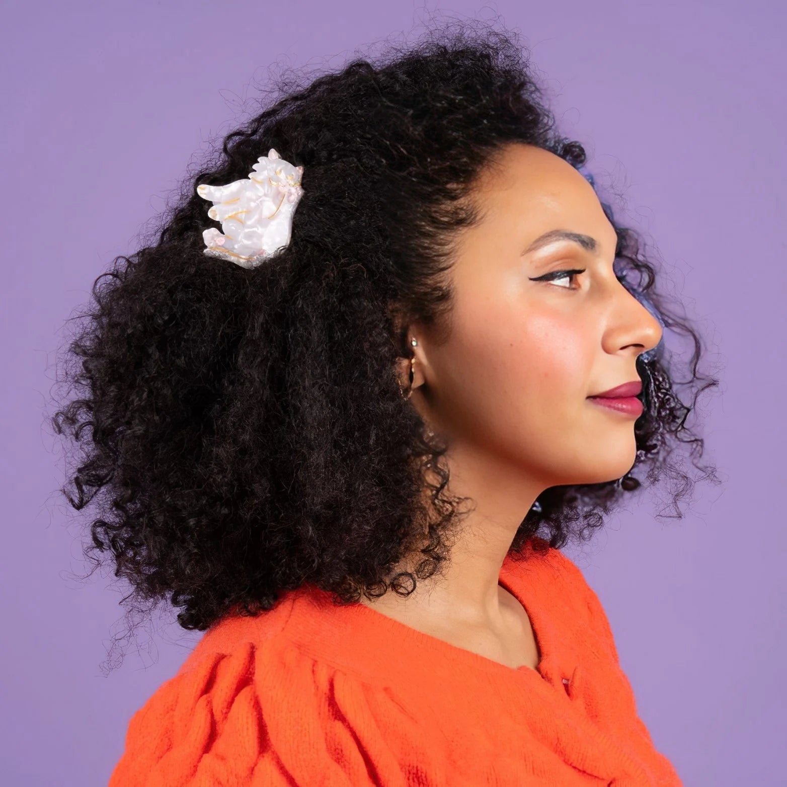Una molletta per capelli a forma di gatto bianco per aggiungere un tocco felino ed elegante alle nostre acconciature. Questo accessorio tiene saldamente qualsiasi chignon o acconciatura semi-raccolta con le sue robuste grinfie. Inoltre siamo ossessionati dallo stile retrò!