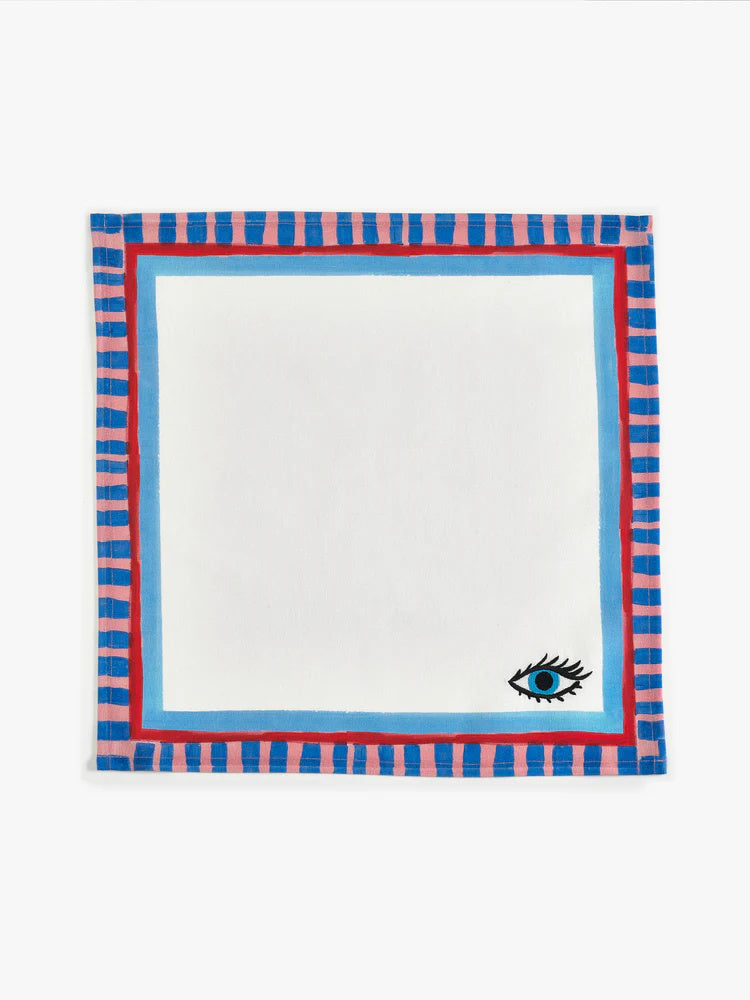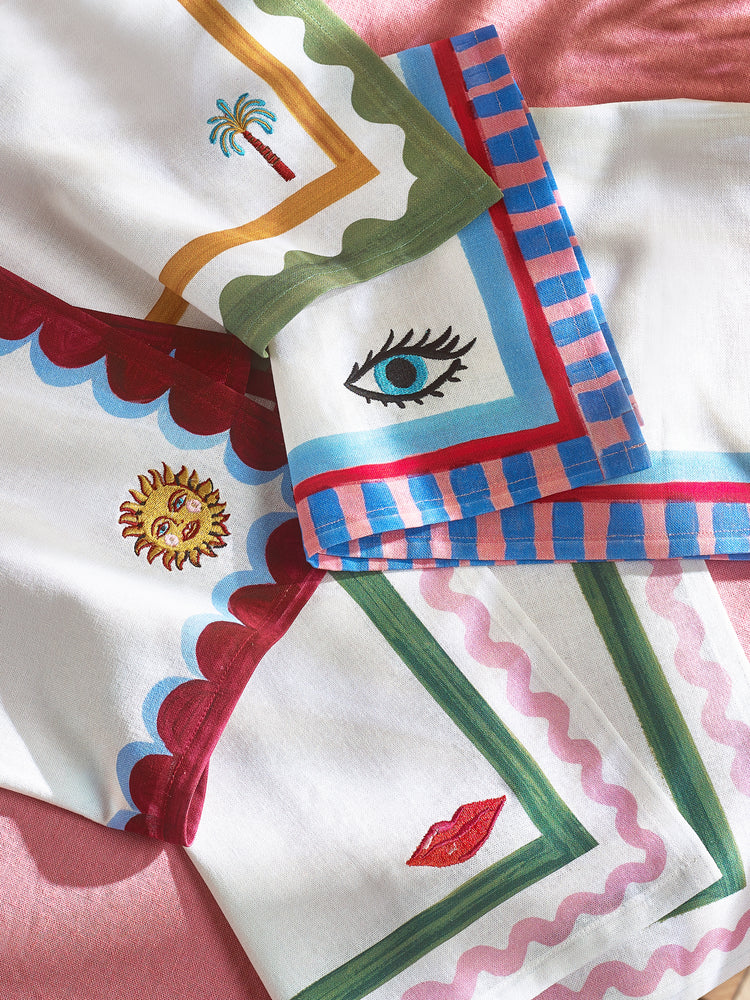 Vi presentiamo questo Set di Quattro Tovaglioli della linea Icon fatta da Eleanor Bowmer x Pure Table Top, tanto divertenti quanto pratici. Ogni tovagliolo presenta illustrazioni uniche e stravaganti, come labbra, palme, occhi e soli, aggiungendo un tocco di colore e allegria a qualsiasi tavola. Realizzati in 100% cotone, sono morbidi ma resistenti, progettati per durare negli anni. Ispirati ai panorami di LA, questi tovaglioli in cotone hanno i bordi dipinti e l'illustrazione è ricamata. Inoltre, hanno una grandezza tale che permette di utilizzarli anche come tovaglietta da colazione