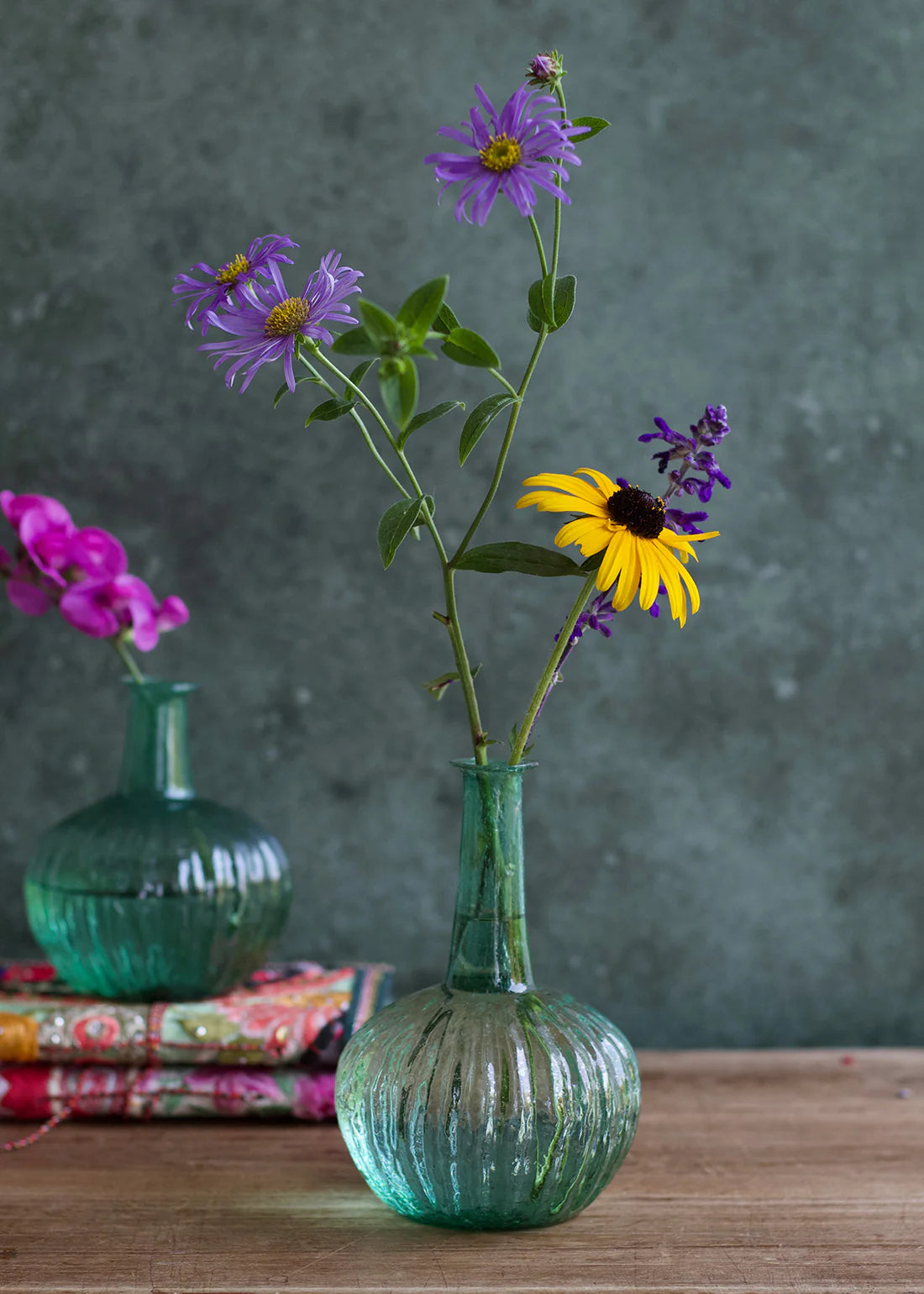 Progettato pensando all'ambiente, questo vaso verde in vetro riciclato offre sia fascino che utilità. Il suo stile si abbina magnificamente con arrangiamenti di fiori freschi o essiccati, creando un look calmo e moderno. Ideale per cene, eventi e spazi di ospitalità, è un pezzo di arredamento ponderato che evidenzia la sostenibilità senza compromettere lo stile.